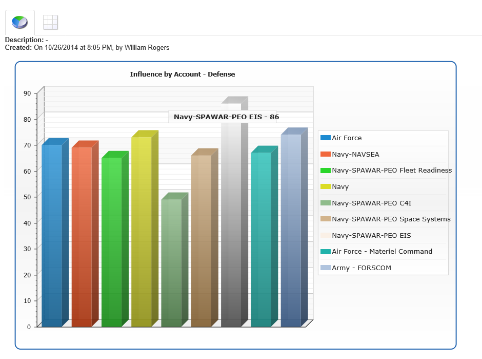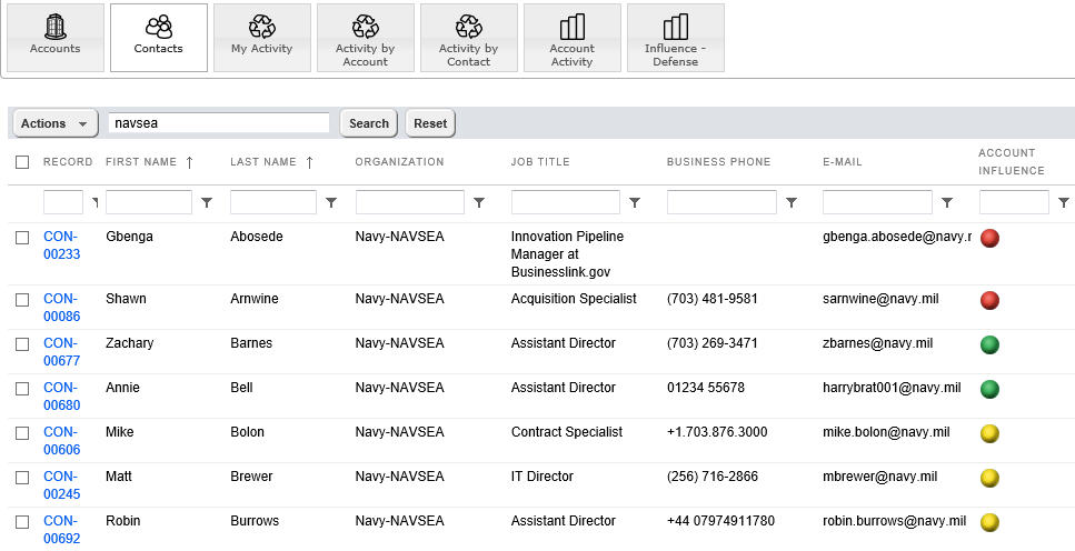 Understanding the influence of your contacts on customer accounts and opportunities is an important part of capture activities. This report shows the influence of contacts within Defense accounts. Influence is tracked by levels such as 1, 2, 3. It also has color indicators (Green, Red, Yellow). Using this report you can see the relative influence that your contacts have within their organizations. One click to drill down into the specific contact list for each organization.  This is just one example of many reports that you can create using the R3 Report Wizard.