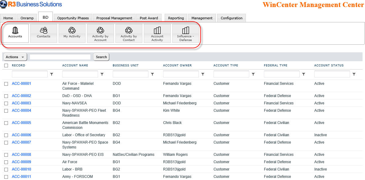 Just drop the R3 Account Management add-in into your R3 work environment. You can then leverage it from within any R3 solutions. Here we show the account management features on the BD tab in WinCenter. You have a choice of different features to put at the fingertips of users. Instantly, WinCenter users can access accounts and contacts, contribute activity, and, view activity from various perspectives.