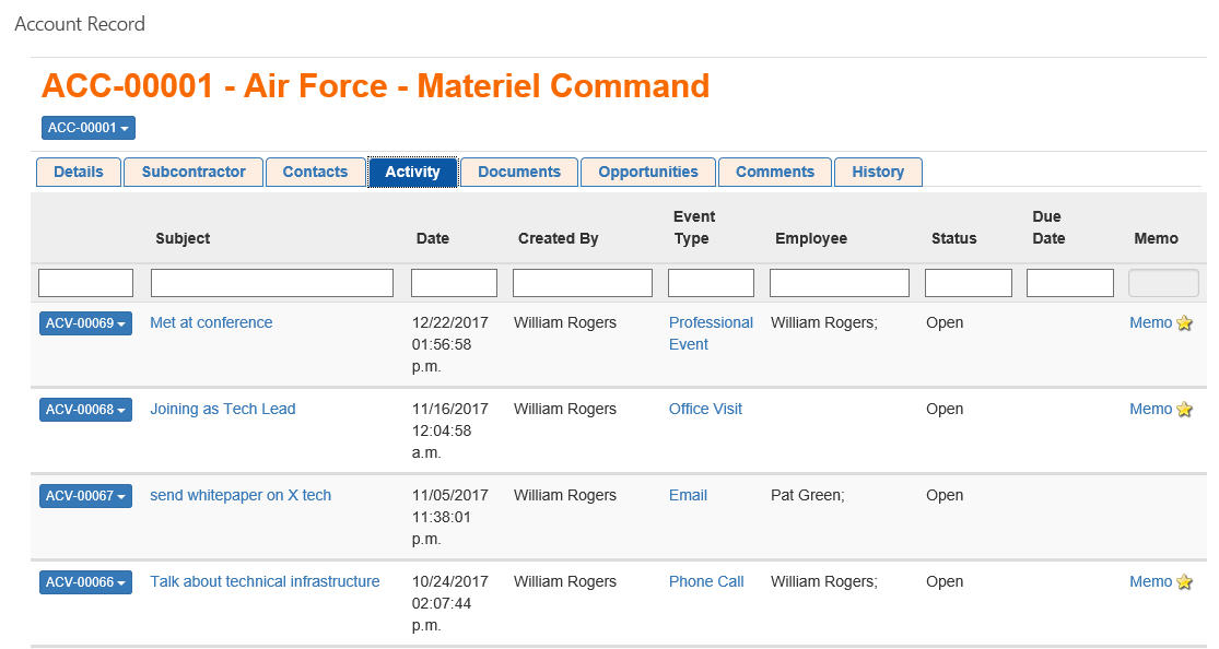 You can quickly log your activity with a contact. You can relate your activity to contacts, opportunities, accounts, and type of activity. The activity can have already happened or be a task for the future. Here we are showing all of the activities for the Air Force Materiel Command