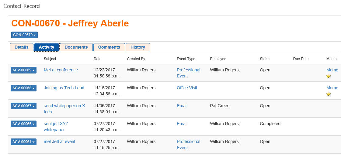 The Contact Record view brings everything together related to each contact. It has the basic contact data and all of the activity for that contact as shown here. And, it supports related documents and collaborative commenting.