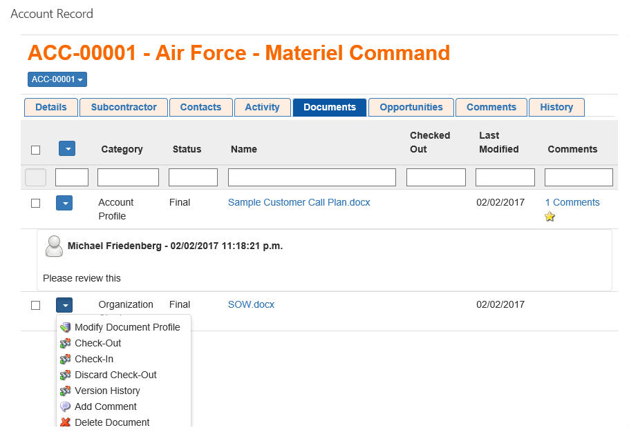 You have rich document management features when working in record views for Accounts, Contacts or each individual Activity. You can manage documents along with collaborative commenting about documents as shown here.